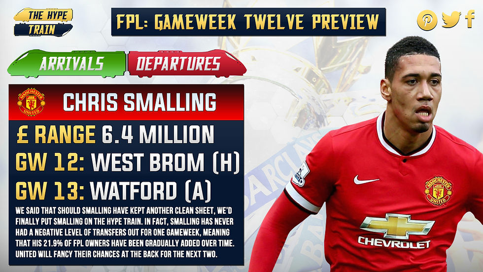Two arrivals from Gameweek 11 have jumped aboard the hype. One for Arsenal, one for United. Mesut Ozil joins after three impressive points returns, whilst Chris Smalling gets a late call up to the Hype after a third clean sheet in a row. Departing is fellow United defender Matteo Darmian, who ends his stay on the Hype after being aboard since the first Gameweek of the season. The Italian international is suspended for United's home game to West Brom, and is one player FPL players are removing. Price drops are certain for Darmian.